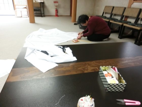 個別指導となれば分かりやすく、身ごろは裁断から要所の説明と5時間ほどで仕上がる、その費用は積善として寺の何某かに使われ、お寺の維持や修繕へ使用されるのでこちらとしてはお役に立て、身につけていただければ何よりです。