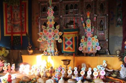 最近行われた法要にて供えられた「トルマ」、ツァンパ(小麦粉)に水とバターを混ぜ練り土台を作り、着色したバターの飾りをつけたもの、暗いところでは一年ぐらいもつそうです。