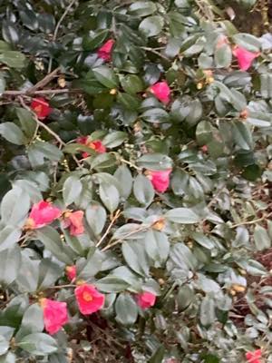 道具倉庫近くの駐車場より、真っ盛りのヤブツバキがみえる