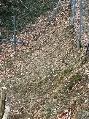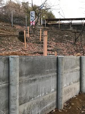 山中では物が小さく見えます、土圧で倒れないようにしっかりアンカーを取っているところです。