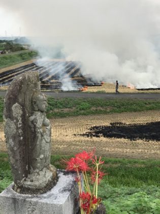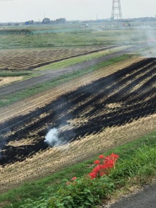 曼珠沙華を背に振り返ると野焼きが行われていました、彼岸花はこの季節珍しいわけでもない、逢いたいことの意がそこにあった。