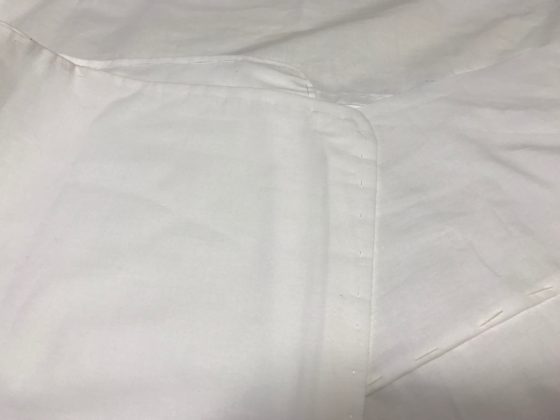 昨夜から、反物を広げ白衣を縫いはじめた、あとは襟と袖、裾を縫うだけなのですが….
