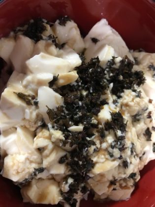 温かいご飯に冷たい豆腐、先日つくった紫蘇醤油漬けをのせ、今夜のゆうげ。