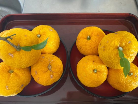 座敷オヤジさんより、ご自宅で収穫された柚子がお供物としてとどきました。