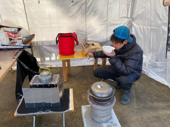 料理と暖をとるため七輪、キャプテンスタック「カマドB5」と風防、今回は両方ともなら炭使用しました。