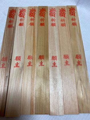 添え護摩木へ種判を一本ずつ手押し、添護摩木(供物)を申し込まれた方の願意とお名前を記し、お札とハンカチへ祈祷する際のその方の供物を投じ、供物が火炎となって厄を落とし浄めます、供物に書かれたお名前を唱えていきます。