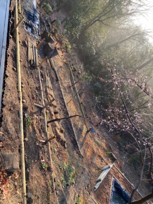 オレンジのテント片面が三メーター、一番下の段まで土を運びます。
