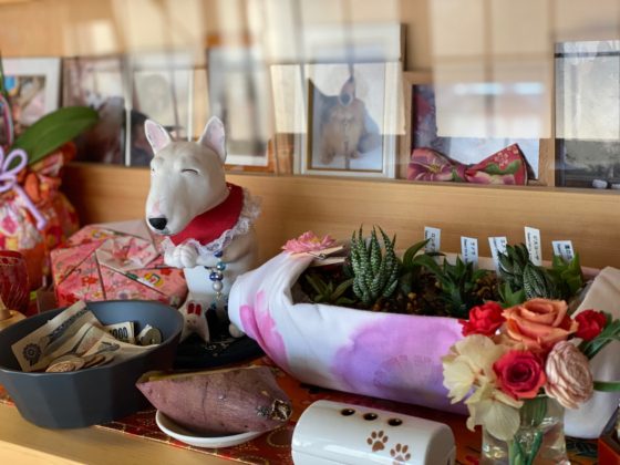 右がサボバナ、手染めの晒しでおしゃれにくるり巻き、サツマイモのお供えにニッコリなテラです。