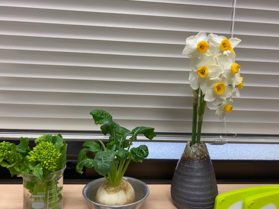 凍り折れてしまった水仙、七草のカブ、本日の菜の花が窓辺を飾ってくれている