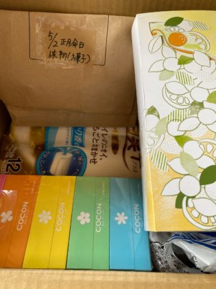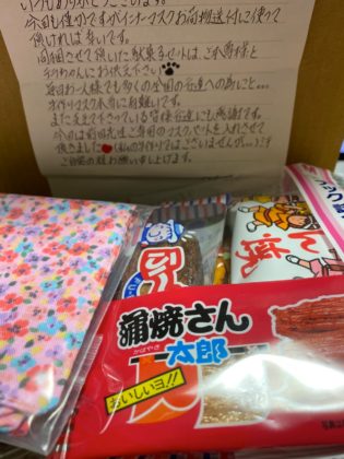 日用品や手作りマスク、山整備や畑に使用する肥料を添えてくださり、有難うございます。