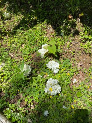 箒を隠され頭にきちゃったのかしら、カラスが花を千切って捨ててありました、仕方がないので毛の半分抜けた箒を出しときました。