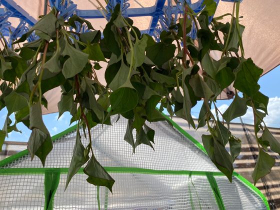 日陰をつくり、縄をより合わせている暇がなく、ここは洗濯干しを活用(笑