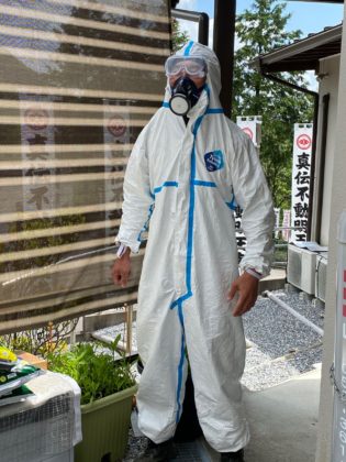 何故、防護服かといいますとイラガも多く、首筋や肌が露出しているところは危ないですものね。