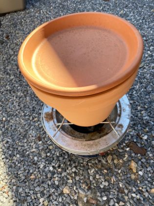 座敷オヤジさん こんにちは キャンプ用コンロです、その上に素焼き植木鉢と同じく素焼き受け皿(*^^*) もう仕上げたの!!早いですね。少し足並みを揃えたいので少々お待ちくださいませ。