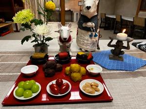 写真供養のみんなを代表し、小豆団子とさつまいも団子、お山の美味しい水と菊水を添えて♪