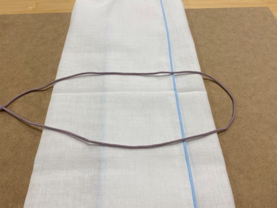 ゴム紐なければパンツのゴムでも構いません、耳にかけてきつくない長さに調整し、写真のように真ん中へ置きます。