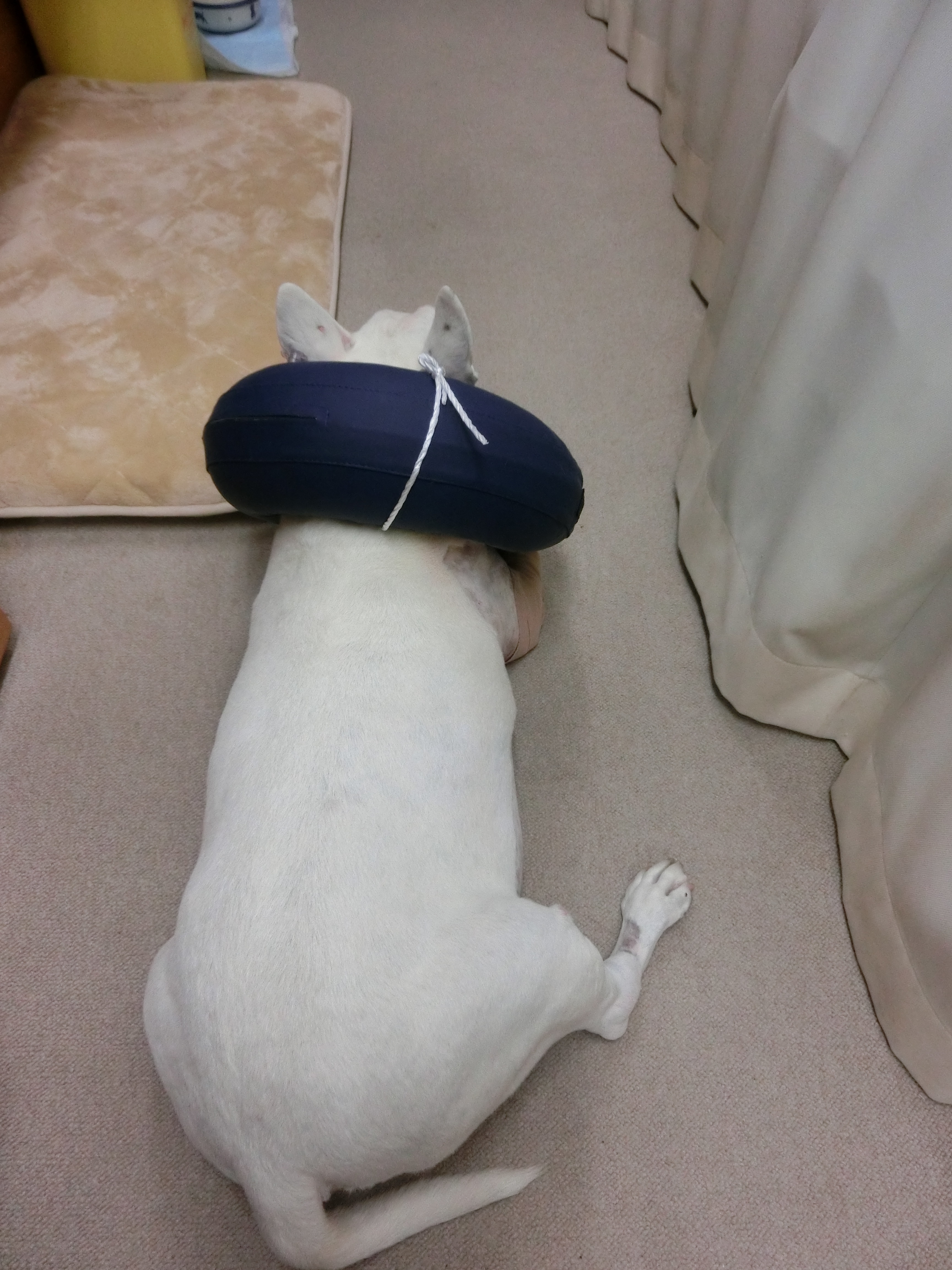 痩せてしまったので、カラーが落ちてしまうので紐で縛ってやりました。