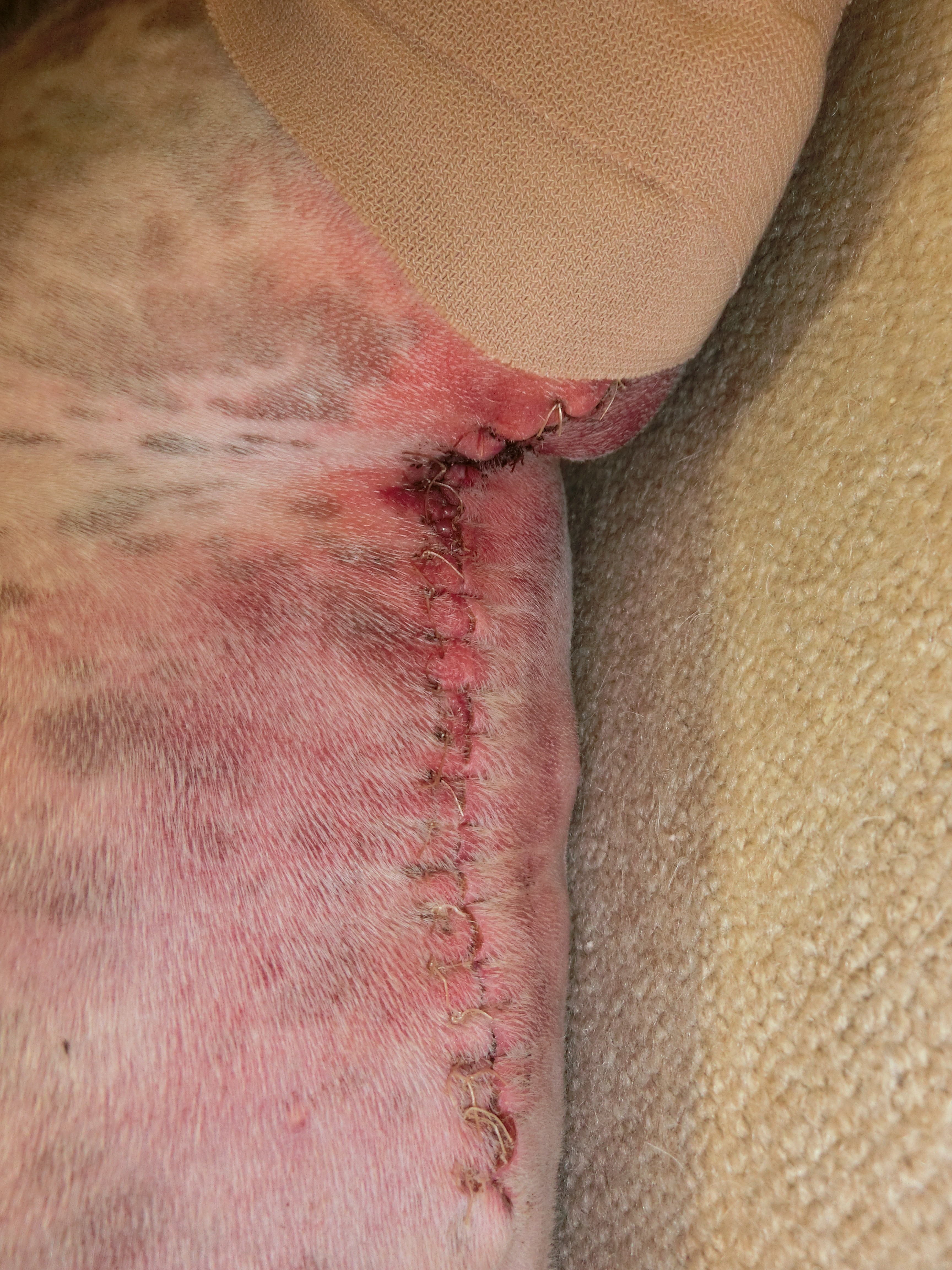 傷跡は痛々しいけど、頑張った証拠です。しばらく大変でしょうが、近くにいてあげて下さいませ。今度、好物の物をお持ちしたいと思っています。