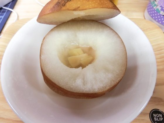 これからの季節、のどと言いましょうか気管支や肺が痛みやすく、お下がりの梨の真ん中をくり抜き、生姜とはちみつを少々&水を少々入れ器にラップをして蒸し器やレンジでチン♪