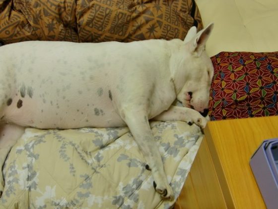 暑い時や熱があるとき、動物の本能なのでしょうね、そば枕に頭をのせたり押し付けたりしながら寝ていました、テラの枕カバーは「麻の葉」柄です。
